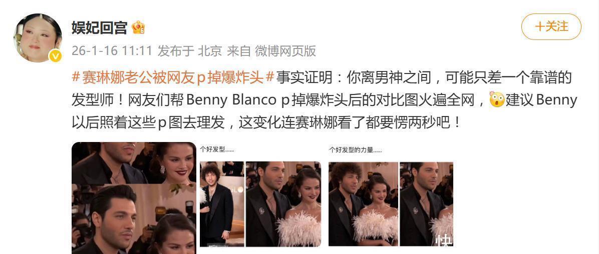 据网友1月16日爆料,最近,一组“换头术”对比图在国内外社交平台彻底火了。网友们手动“操刀”,把赛琳娜·戈麦斯的老公——音乐制作人本尼·布兰科那标志性的蓬松爆炸头P掉,换成了清爽的背头、利落的短发。好家伙,这一P可不得了,本尼的气质直接从“随性不羁的音乐人”秒变“精致干练的型男”,视觉冲击力拉满。